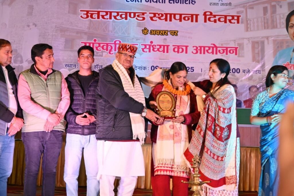 उन्होंने कहा कि इन 25 वर्षों में राज्य ने बहुत तरक्की की है। कृषि, उद्यान और ग्राम्य विकास विभाग में अभूतपूर्व कार्य हुए हैं। उत्तराखंड यूसीसी लागू करने वाला देश का पहला राज्य बना है। धामी सरकार ने सख्त नकल कानून और धर्मांतरण कानून जैसे कई बड़े ऐतिहासिक फैसले लिए हैं। उन्होंने आगे कहा कि समूहों के माध्यम से महिलाओं को मजबूत किया जा रहा है। आज 1.65 लाख बहिनें लखपति दीदी बन चुकी हैं। उन्होंने यह भी कहा कि एयर, रेल और सड़क कनेक्टिविटी के क्षेत्र में राज्य सरकार ने ऐतिहासिक कार्य किए हैं। उन्होंने सभी को राज्य स्थापना दिवस की रजत जयंती की बधाई एवं शुभकामनाएं भी दीं। इस अवसर पर कैबिनेट मंत्री गणेश जोशी ने सांस्कृतिक कार्यक्रम में प्रतिभाग करने वाले प्रतिभागियों और कलाकारों को भी सम्मानित किया।
